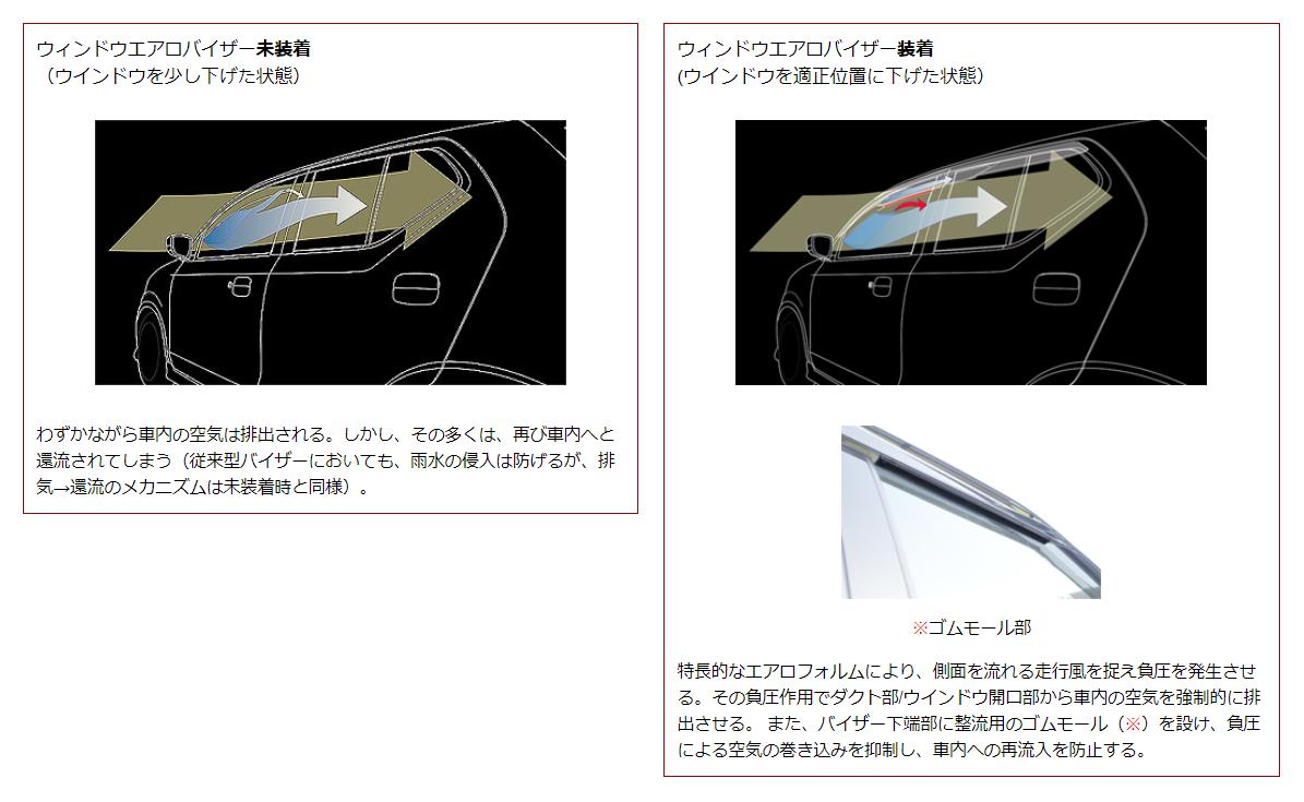 走行風を利用し、バイザーのエアロ効果で負圧を発生させる事で、車室内の空気を積極的に排出させます。バイザー本体に整流用のゴムモールを設け、一度外に出た空気が、再度室内へ戻る事を防止します。